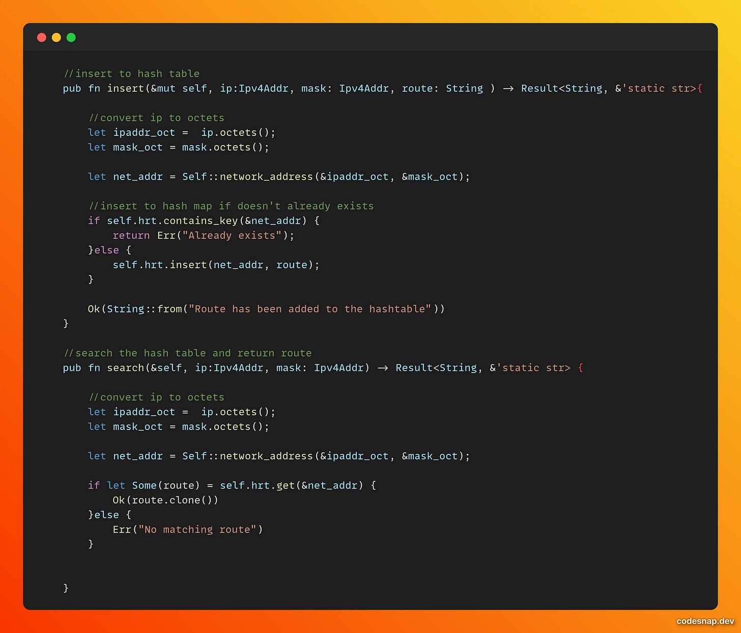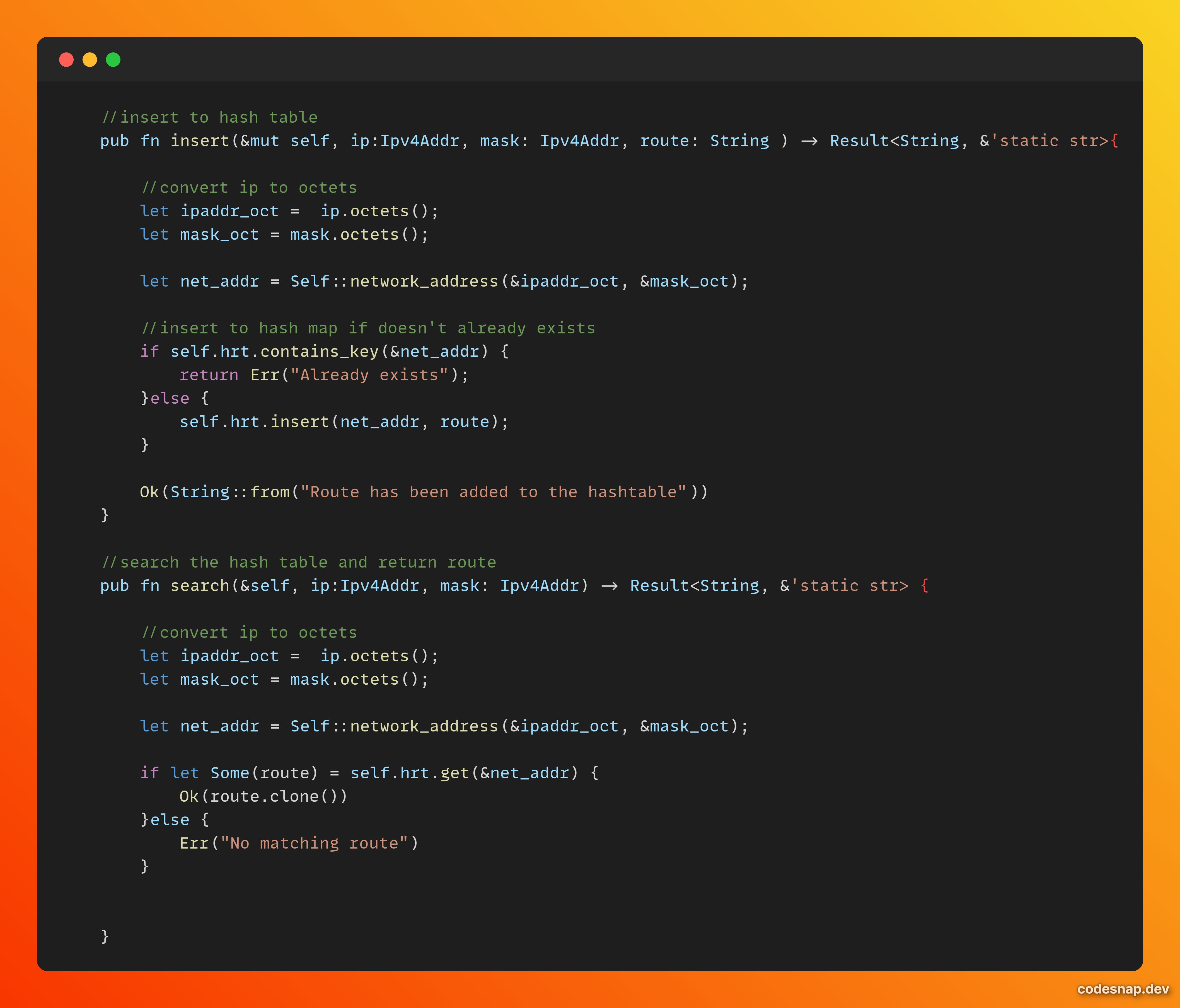 After we implement these methods and functions. We start by instantiating the Hash Routing table, adding the entries to the table and searching the table to get an exact match.
