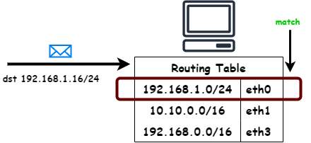 In the figure, the device (like a server or a router) receives a packet (doesn’t matter the source), and the device recognizes that the destination of the packet should be 192.168.1.16. Referring to the routing table it decides to send the packet to interface eth0. The routing table has an interface (next hop) for each network address.